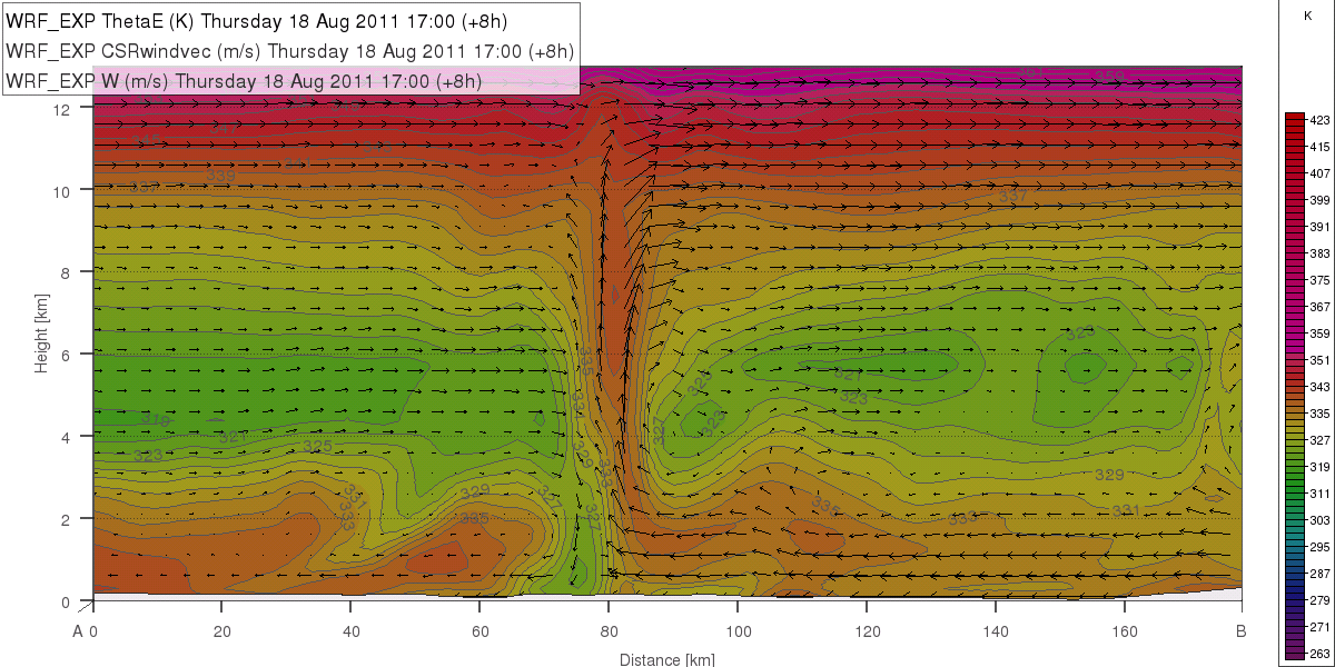 Fig. 3.4. WRF 8 h forecast for 18 August 2011 17 UTC shown along the vertical cross section indicated in Fig. 3.3. Equivalent potential temperature (colors and gray contours, K), cross section and storm-relative wind vectors (arrows, m/sec)