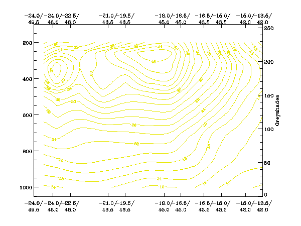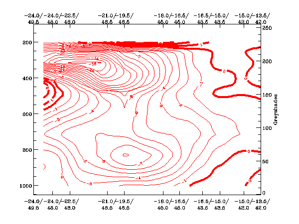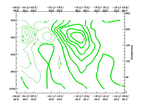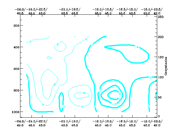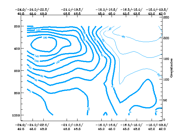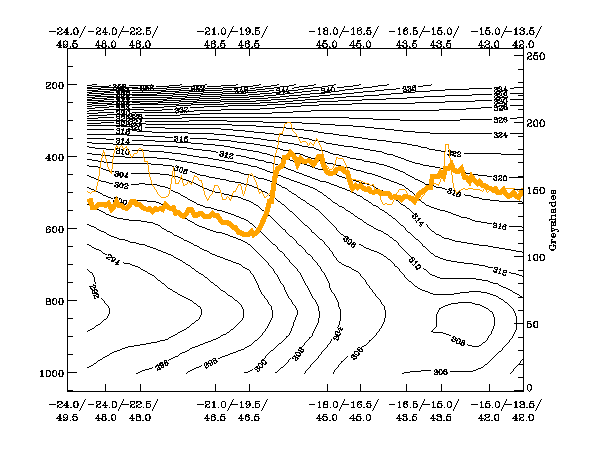 Maximum of upward motion is located in the lower layers in the region just ahead the ground front. It is nicely correlated to the highest pixel values. Downward motion occurs behind the frontal zone.