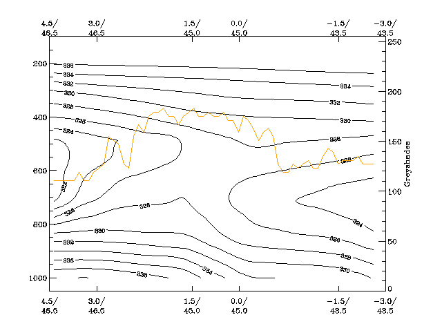 | This is a cross section across the warm front, but similar to the case of the cold front, this is also not a typical appearance of the isentropes for the cross-section through a warm front. There is actually no zone of upwards inclined isentropes, as could be expected in the warm front. |