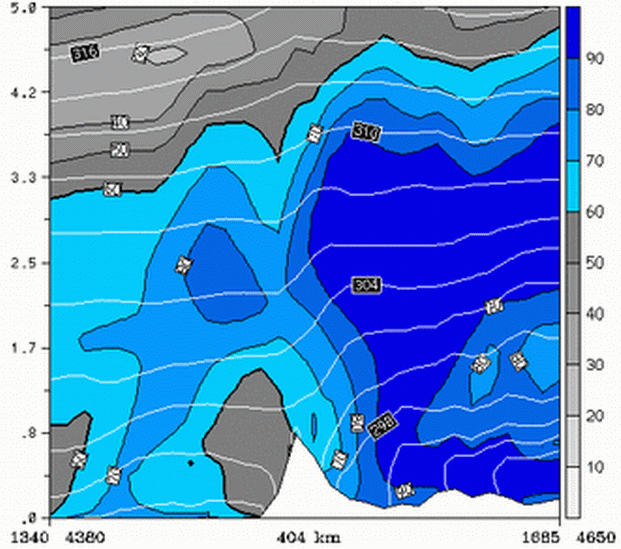 The image below is the cross-section derived from the ALADIN model along the line A, directed from south-west to north-east. The distribution of humidity in the vertical along the cross-section can be clearly seen.