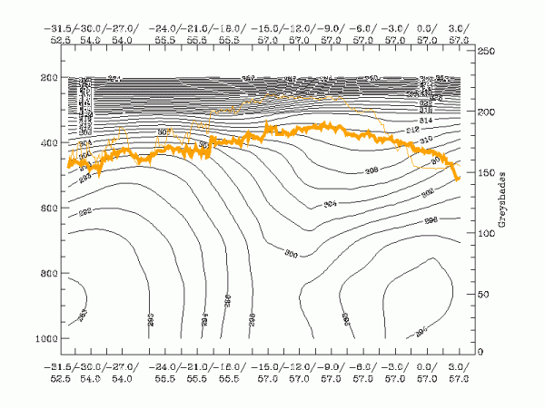 Now that you have solved this question, you can look at this cross section in more details. Just follow this link and you will see what other meteorological parameters look like in the vertical in this part of the frontal system. You can overlay parameters on the isentropes cross-section and, by clicking on the i, you can get the information about the parameter you are looking at.