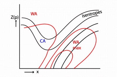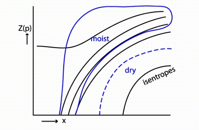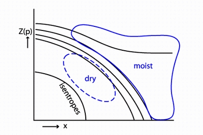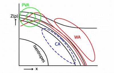In the occlusion fronts the isentropes usually form a typical X or Y shape showing that cold and warm fronts are meeting. The trough that the isentropes form in the cross-section represents warm air. The schematics here show a Warm Front Occlusion, therefore the frontal zone of the warm front is seen in the lower layers. Maximum of warm advection is found in the warm front area and at the leading part of the isentropic trough, whereas cold advection occurs behind and above the isentropic trough. |