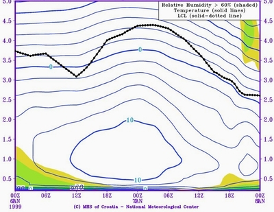 | TEMPERATURE Cross-section of temperature, for example, can give the idea where temperature inversions are located and also where the gradient of temperature is the strongest. An example here shows a large inversion layer in the middle of the cross-section, between ground and 2km height. This is a time-cross section, so according to this it is expected that the inversion would form in the afternoon hours and persist until noon next day. This kind of information given by temperature cross-section is very useful in forecasting fog, for example. |