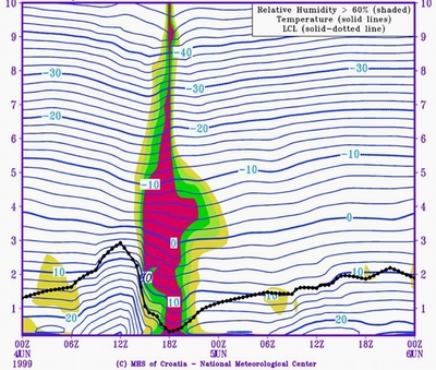 | RELATIVE HUMIDITY Cross-section of relative humidity shows the distribution of humidity in the vertical. In the example here it is the case of intensive convection with high humidity levels reaching up to the top of the troposphere. This is also a very nice example showing strong temperature changes connected to this convective development which are clearly visible in the lower 2 km, but also in higher troposphere in form of tropopause folding. |
