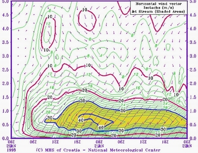 | WIND Cross-section of wind gives the location (height) of the jet streak, but in some cases, as in this example, it is very useful for locating low level jet or the region of very strong wind in the lower tropopause. This example here shows that the model forecast the maximum of the north-easterly wind up to 40 m/s in the layer from the ground to about 1.5 km height. This is the situation with very strong Bora wind which blows on the Croatian coast of Adriatic Sea. Situations like this one occur several times a year! Since this is a time cross-section it can be concluded that this very strong wind will persist for two whole days! |