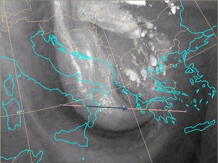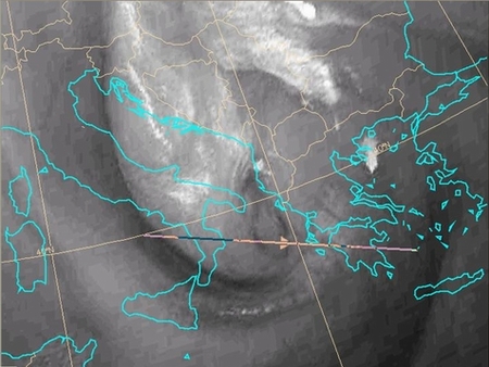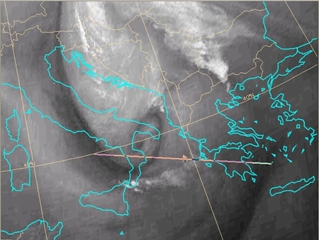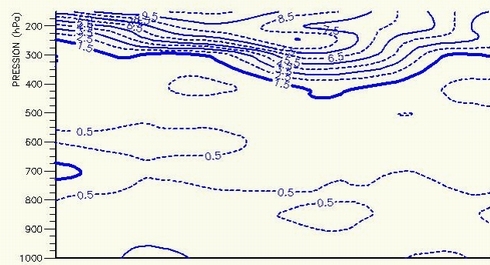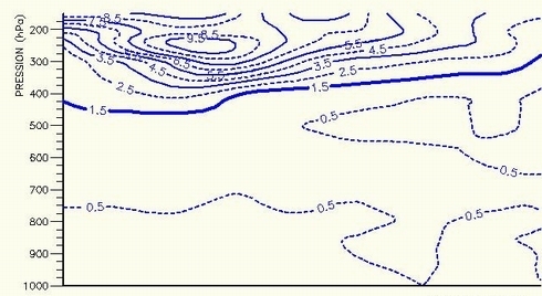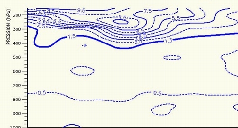 It clearly shows that the isoline of PV of 1.5 PVU is lowered down to 450 hPa in the left end of the cross-section, coinciding with the dark area in the satellite image. |