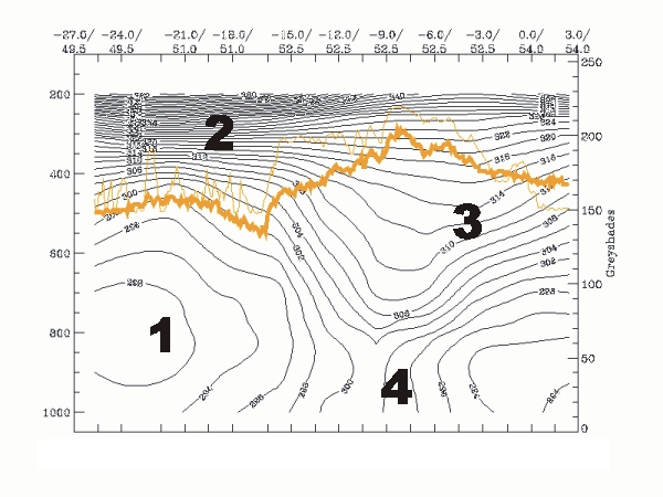 In the following image, showing a cross-section of the isentropes, answer which of the regions marked by numbers is stable, very stable, unstable or neutral.