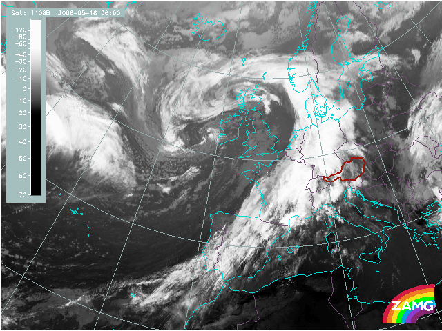 It shows a well developed cloud spiral north, northwest of Scotland and the cloud band of a cold front from Germany across France to Spain. At its rearward cloud boundary a typical wave bulge can be seen in the Bay of Biscay. Cloud fields over Switzerland, North Italy and Austria belong typically to a warm front and warm sector.