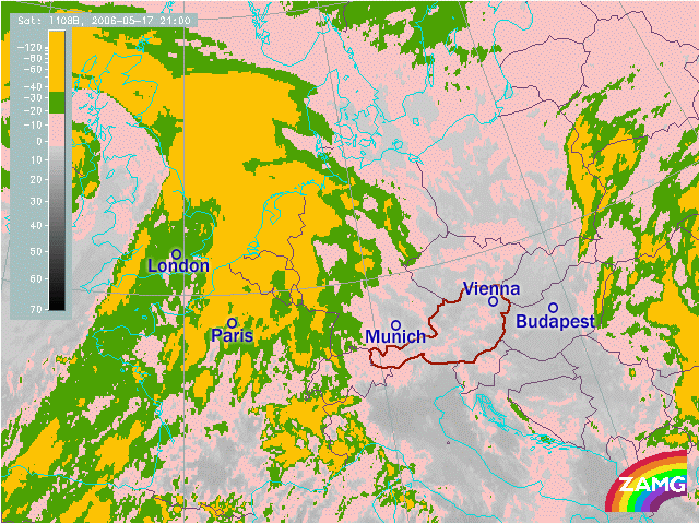 "Now after having diagnosed the frontal system and its synoptic scale eastward propagation path the concentration should be on small scale problems and changes. The advection and crossing of the cloud system of the front should be nowcasted for some of the big European cities: London - Paris - Munic - Vienna - Budapest."