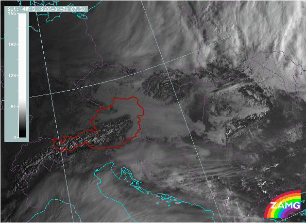 In the HRVIS images the Danube valley in Austria and Bavaria, North and East Austria and big parts of Hungary show the typical cloud structure of fog. Especially the clear cut cloud edges at the mountain chains are typical, also the snow structure in the cloud free mountains. But besides the extended fog areas this example shows also valley fog in the Alps. Especially distinct is the fog in a NE - SW oriented valley in East Austria (Mürz - Mur rivers).