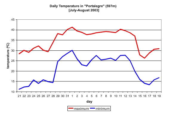 The air temperature was very high during this period, with maximum temperatures of just over 40ēC and minimum temperatures close to 30ēC (Figure 2.4). The continuous high temperatures and drought made the 2003 summer in Portugal especially severe and increased the potential for forest fires.