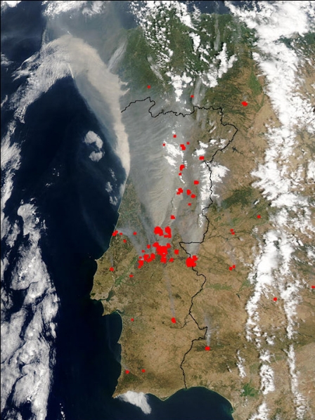 We will start with the famous and deadly heat wave that hit Western Europe in the summer of 2003. Portugal was plagued by a huge amount of uncontrolled forest fires (more than 1500 in August alone), leading to a total burnt area of around 424.000 hectares in the whole year. This corresponds to about 4.5% of the country's land area.