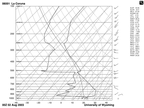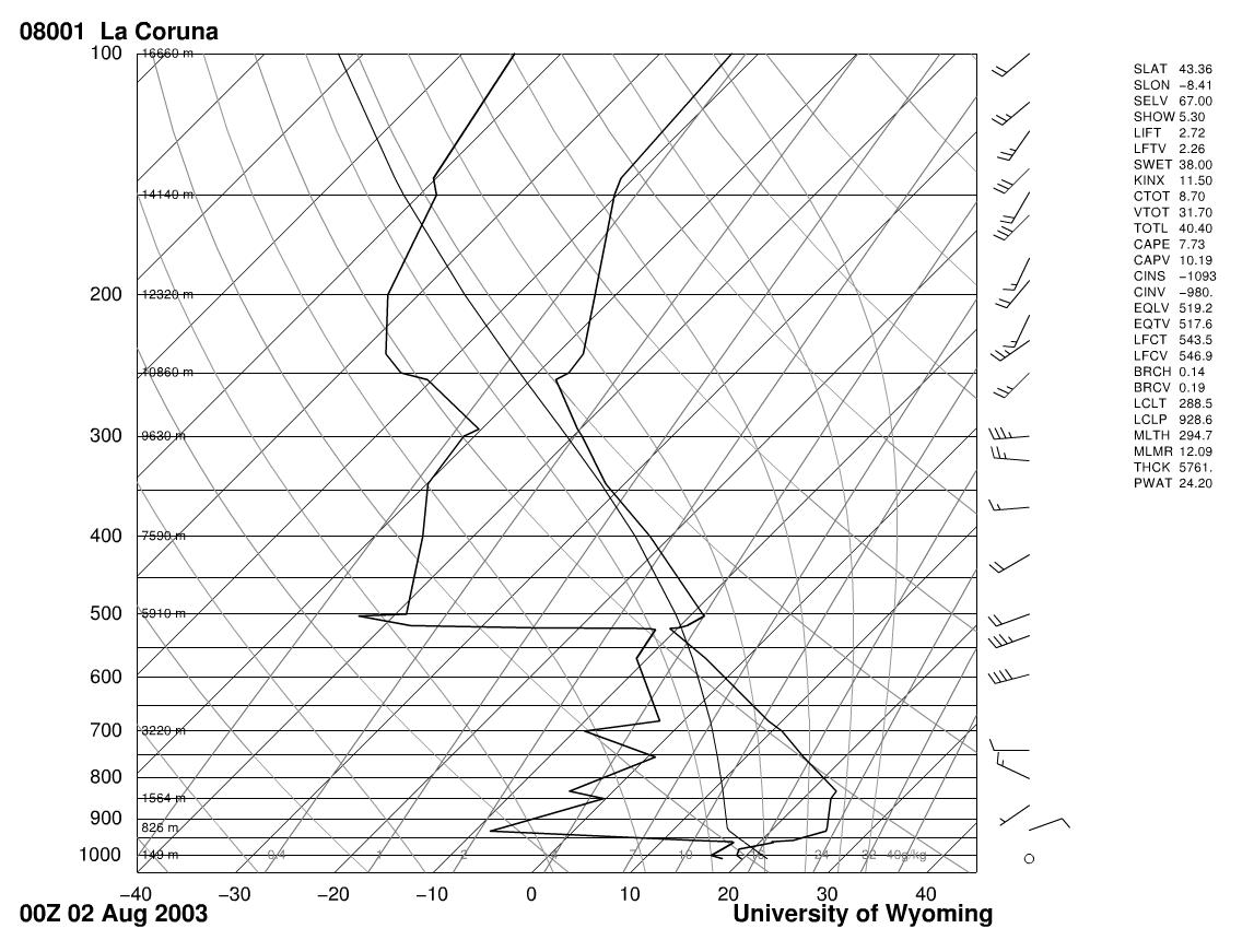 As you can see, a thermal inversion in the medium levels is also present in the tephigram of La Coruņa, Spain in Figure 2.6.