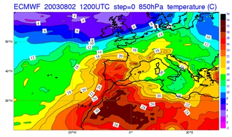The correct answer is B. The air temperature lies between around 22ēC and 26ēC at 850 hPa! These values are clearly above the mean for that area during summer months, which varies between 12ēC and 20ēC. In fact, temperatures over the Peninsula in that day are closer to mean values over the arid region in Northern Africa.