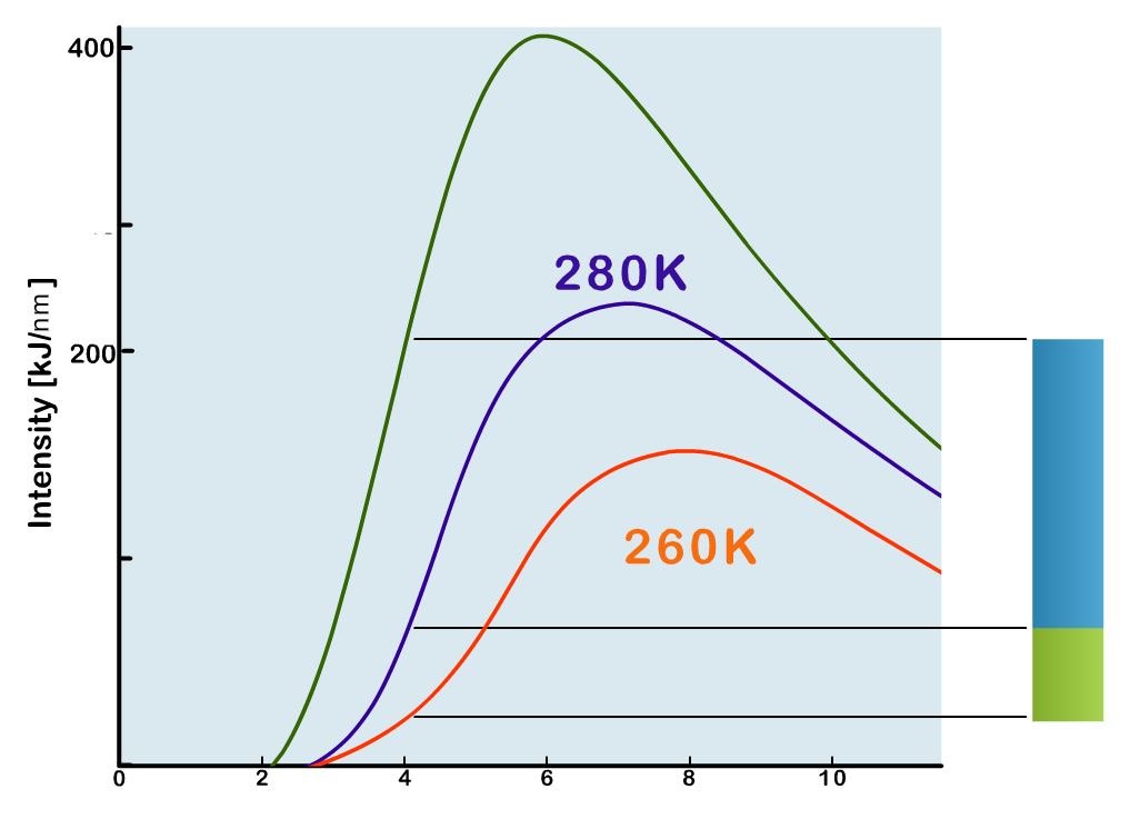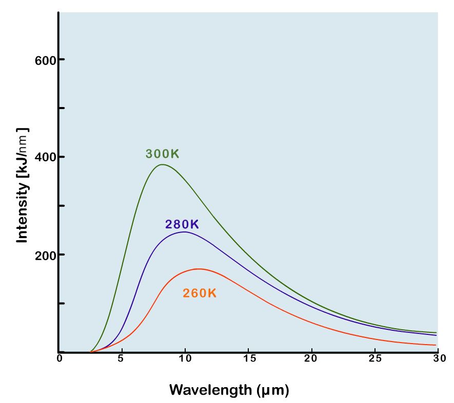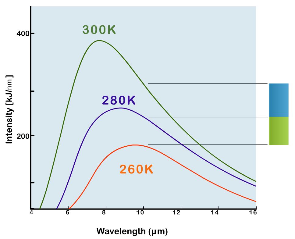 At 10 μm a temperature change from 280 K to 300 K (blue bar) yields a change in intensity slightly larger than the change in intensity from 260 K to 280 K (green bar)!