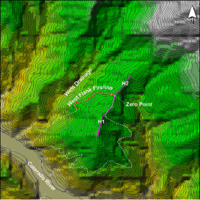 In fact, when a fire reaches the top of a hill, an increase in the fire spread rate is expected as winds are strongest there. However, when the fire advances to the lee side on the hill and starts to propagate downslope, there is a strong decrease on fire spread rate. This happens, not only because of the effect of (down)slope, but also because winds are weaker in the lee side (Forthofer, 2007).