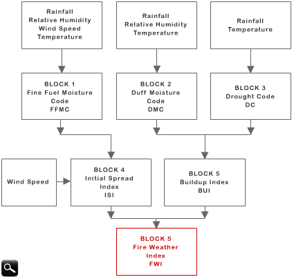 FWI is made of surface observations at noon and represents fire danger at mid-afternoon. You will see that FWI is composed of individual indexes that give information on specific details. Let's see the meaning of each sub-index: