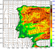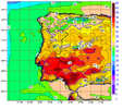 As an example, you can check the difference in patterns between the forecast fields of a limited area model (Figure 3.15 and 3.16) and the FWI index computed on the verification date (Figure 3.17). The forecast is for 12 UTC on 3 August 2003, which was the day following the aforementioned 2003 event. Thus we conclude that the pattern for forest fires due to weather parameters (FWI) differs from the single patterns for 2m temperature or 10m wind.