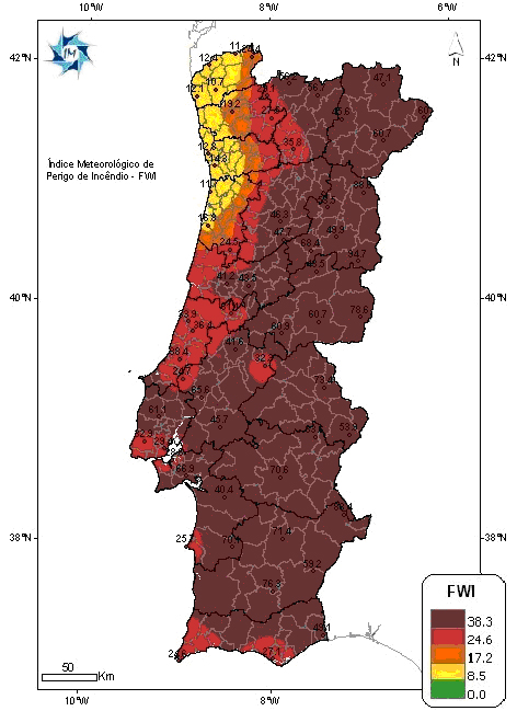 - The Portuguese Meteorological Service System, with the computation of a Combined Index for Forest Fire Risk (ICRIF, Portuguese acronym). ICRIF combines FWI, a structural index and a vegetation index. The structural index is obtained from a land cover database (CORINE 2000), associating a specific risk weight to each of the 44 classes of land cover. The vegetation index is the NDVI, which you already had the opportunity to analyze before in this module. (www.meteo.pt, Bugalho and Pessanha, 2007).