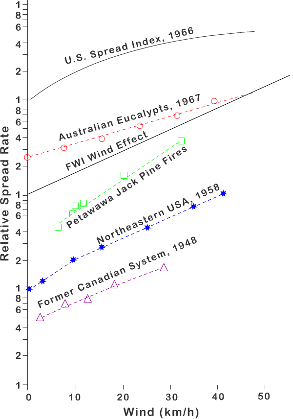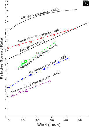 In Figure 3.3 you can see the results of several studies in Australia, Canada and the USA. The stronger the wind, the faster the spread rate. Note that the spread rate is in a logarithmic scale - so fire spread rate increases approximately exponentially with wind speed!