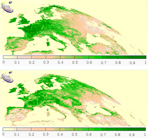 In Figure 3.4 it is possible to evaluate FVC before and after the fire season of 2007, which mainly affected Italy and Greece. You can identify a drastic decrease in vegetation cover, to which fires have most likely contributed along with other reasons such as crops having been harvested or leaves drying out.