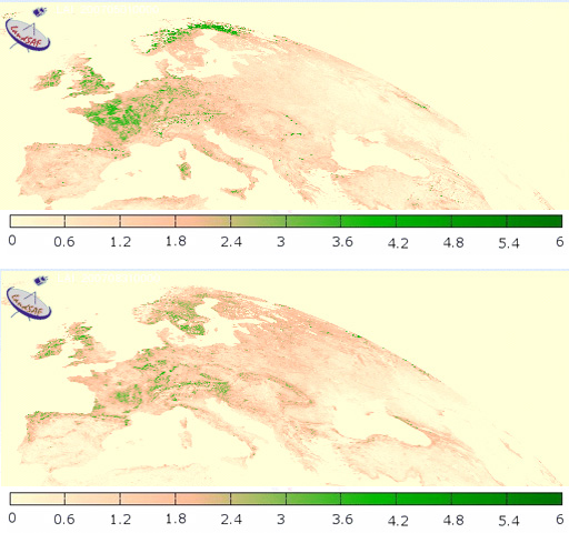 Note that the decrease in vegetation that can be seen in the two images from May and August 2007 may not be completely related to the forest fires in Italy and Greece, as this period coincides with a natural decay of vegetation in these regions.