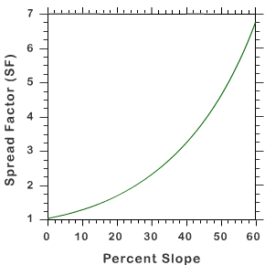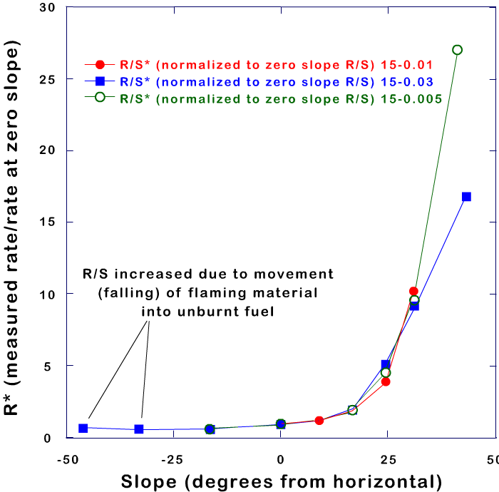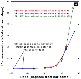 The graphics show that a fire propagates faster upslope if a terrain is steeper and that the spread increases dramatically for slopes greater than 10º. However, it also shows that the behaviour is quite different for a downslope fire propagation (negative values of slope):