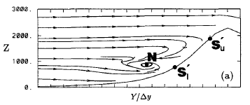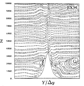 In numerical experiments (eg. Olafsson and Bougeault, 1996) it was found that for Nh/U > 1.4 (therefore for steeper mountains) most of the air mass that meets the mountain is decelerated and partly reversed (Figures 3.8 and 3.9).