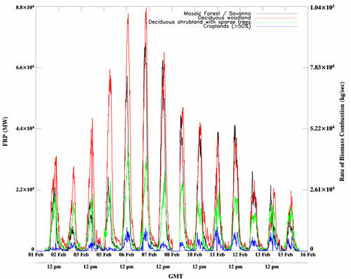 Although it might be easier to identify small/weak forest fires with a polar orbiter satellite, like is the case of MODIS, the high temporal frequency provided by geostationary observations enables to follow the life cycle of the identified fires. An example of this is provided by fig. 5.19 showing the temporal behaviour of the wild fires over the Sahel region for 2 weeks in 2004 as captured by a fire product derived from Meteosat 9, the Fire Radiative Power (in short, FRP) (on the left axis). This product is also being computed by the LSA SAF. As you can see, the temporal behaviour of the fire activity is very well captured by the high SEVIRI revisiting time (15 minutes). The colors represent different land covers; Mosaic Forest, Savanna and Deciduous woodland have the most pronounced diurnal cycle of the fire activity.