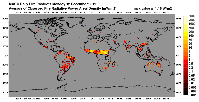 Figure 5.20 presents the thermal radiation coming from actively burning vegetation and other open fires for 12 October 2011. The data is derived from SEVIRI (LSA SAF) and MODIS (NASA) and calculated as daily averages of FRP in 125 km grid cells [mW/m2]. This (daily average) FRP areal intensity data is computed within the D-Fire subproject, which provides data of global emissions from biomass burning that are used as model input for smoke distribution forecasts (organic matter, black carbon and sulfate aerosols). The emissions are calculated in real time and retrospectively from satellite-based observations of open fires (for example wildfires and human-ignited grassland and forest fires).