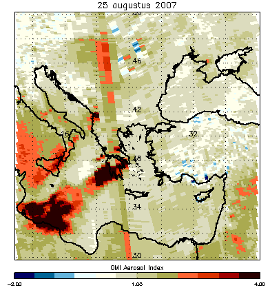 This image of the aerosol index measured by the OMI (Ozone Monitoring Instrument) instrument on 25 August 2007 clearly shows the soot of the fires blown from the Peloponnesus in Greece to Libya.