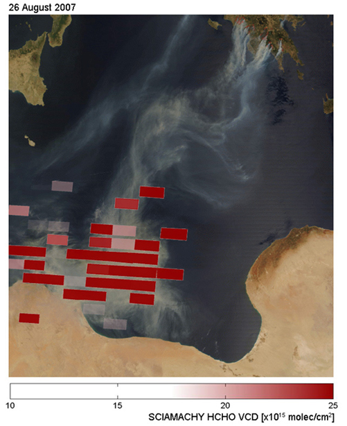 An example of formaldehyde concentration on 26 August 2007, derived from the SCIAMACHY sensor onboard ESA's ENVISAT satellite. Formaldehyde (together with NO2) is a poisonous gas released by biomass burning and was detected off the coast of Libya. Note also that, again, the smoke in the background image has more contrast over sea than over land.