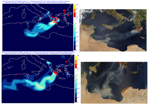 The left panel shows the fire intensity observed by the SEVIRI instrument in terms of fire radiative power (FRP per unit area at 25 km resolution, reddish color bar) and the optical depth of the simulated resulting smoke aerosols (AOD, bluish color bar) for 26 and 27 August. Images on the right show concurrent MODIS observations; the simulations and observations of the Greek fire plumes display very similar shapes. (source: landsaf.meteo.pt)