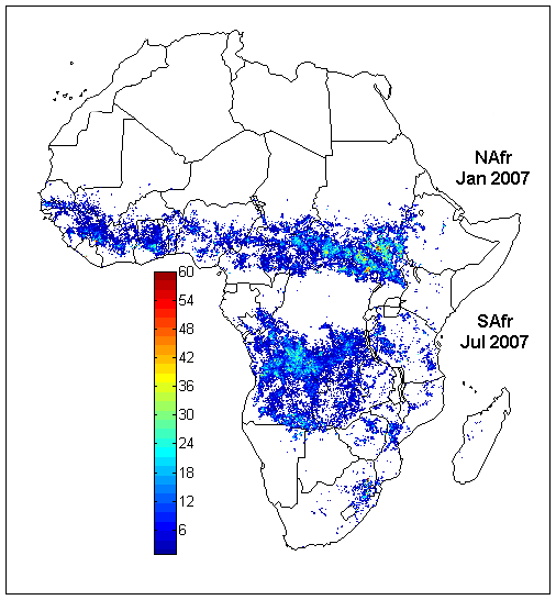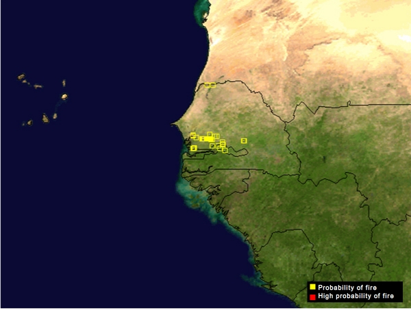 Figure 5.1, obtained from Meteosat 9 at 14 UTC on 22 January 2008, shows the locations of probable fires over Central Africa. Yellow squares denote a lower probability and red squares a higher probability for fires.