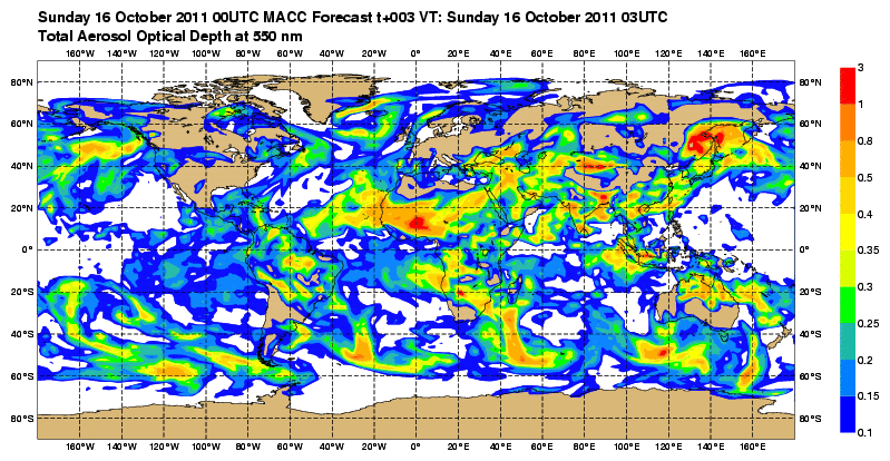 The MACC (Monitoring Atmospheric Composition & Climate) project computes forecasts of "anthropogenic aerosols", defined as organic matter, black carbon and sulfate aerosols that are emitted from fires and other, mostly anthropogenic, sources. An example of simulated aerosol optical depth (AOD), including emissions derived from the latest observed fire distribution and assimilation of space-borne AOD observations, including emissions derived from the latest observed fire distribution and assimilation of space-borne AOD observations, is shown in Figure 5.34. The fire distribution maps used as input in these simulations are obtained from the D-fire subproject, as mentioned in the Hot Spots Gallery subchapter.