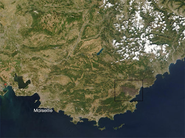 The brownish shade east of Marseille is due to the decreased albedo resulting from the fires.