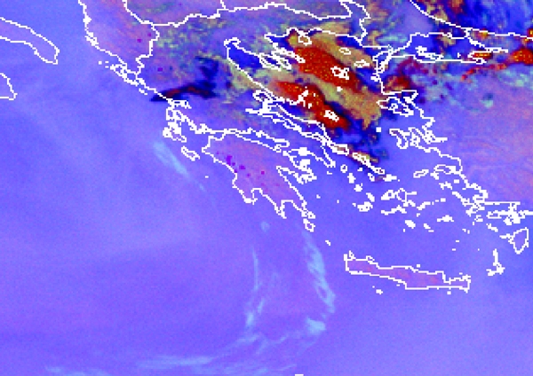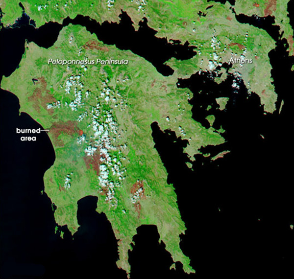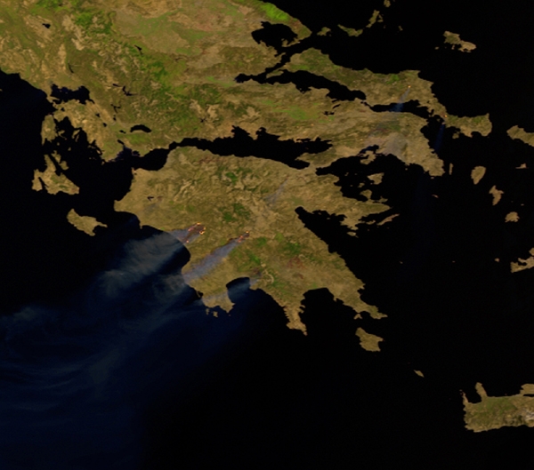 A slightly older example shows the aftermath of the fires that raged over Greece during the hot summer in 2003. Brownish areas depicting the burned regions can be identified all over the Peloponnesian Peninsula, as well as north of Athens. This MODIS RGB image with a 250 m spatial resolution is composed of a combination of visible and infrared bands (2.155 nm/876 nm/670 nm).