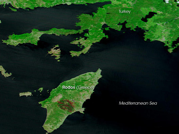 A shot of the island of Rhodes from the summer of 2008. The large burnt area in the middle of the island is easily recognizable.