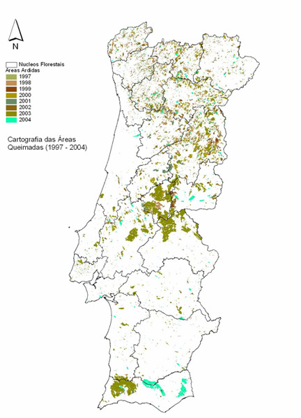 This map of Portugal was obtained with the AVHRR sensor onboard the NOAA satellites between 1997 and 2004, and it shows the burnt areas. Each color corresponds to a different year according to the color code in the top left corner of the image.