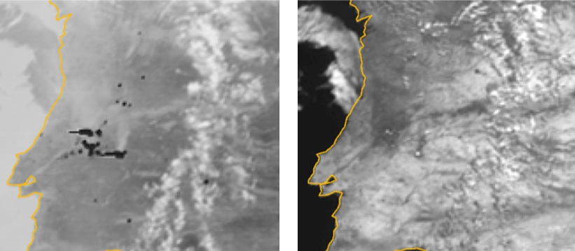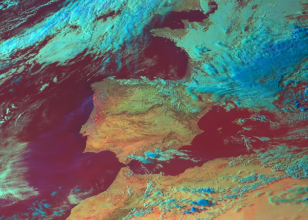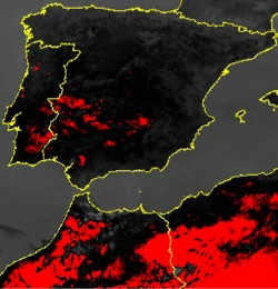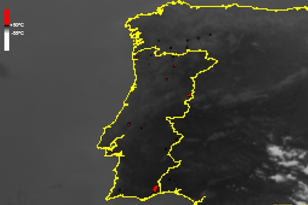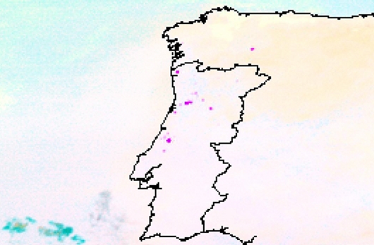 This Figure is an example of an IR3.9 image over Portugal and part of Spain, with hot spots in red, where the brightness temperature exceeds the threshold of 50 ºC.