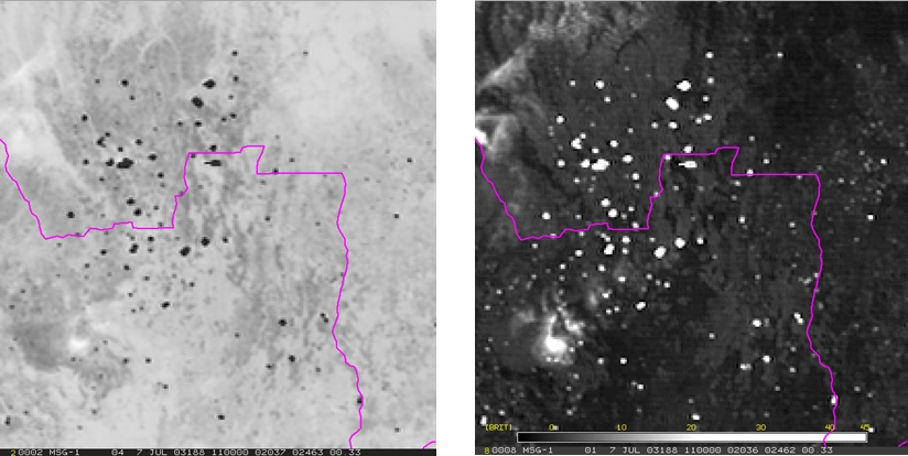 Here is a case of fire hot spots over Congo and Angola. The fires are depicted in both the single IR3.9 image and the difference IR3.9-IR10.8 image.