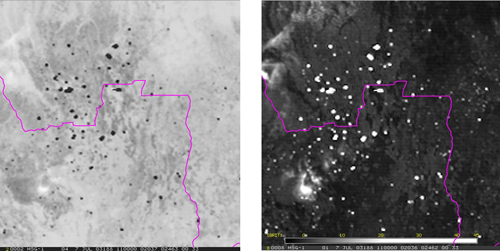 Two Meteosat 8 images are shown here. On the left there is the 3.9 µm (inverted image) and to the right the near-infrared 1.6 µm. Most striking in the 3.9 µm image are the hotspots associated with the fires (darker pixels). A closer look even reveals some smoke swirling northward from those pixels. If fires are too hot they may even be detected using 1.6 µm. In this example, only a few pixels with high radiance values (white pixels) are identified at 1.6 µm, while the number of pixels in the 3.9 band is much larger (number of dark pixels). Note the hot spot color is different in the images, as the IR3.9 is inverted and the NIR1.6 is not!