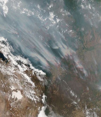 Hundreds, possibly thousands of fires (locations marked in red) were burning in South America when the Moderate Resolution Imaging Spectroradiometer (MODIS) on NASA's Aqua satellite passed overhead on 25 September 2007 and captured this image. The most intense fire activity was in Bolivia, where fires are concentrated in the Santa Cruz Department, in the southeastern part of the country. Thick smoke hangs over much of the scene. The towering Andes mountains (lower left) partially block the flow of smoke to the west.