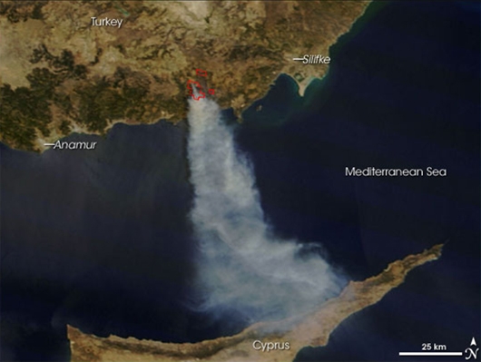 The MODIS fire product mentioned earlier is very well suited for the detection of hotspots in a higher resolution than those obtained from geostationary platforms such as the MSG. This is an example of the MODIS fire product in southern Turkey, in which the hotspots are plotted in red polygons. These are superposed on a composite image using three bands from the visible region of the spectrum. In the image, the smoke generated by the fire is also clearly visible as it is being driven southward and reaches Cyprus.