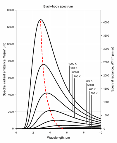 where α is a constant (approx. 2.8214) and λ is the wavelength. Please note that this is an approximation derived from the Planck law (the so-called Rayleigh-Jeans approximation) and is good to about 1% for long wavelengths, and therefore applicable to normal ground temperatures and fire temperatures.