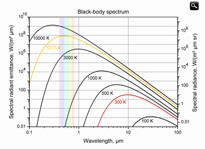 The sun is a reasonably good approximation of a black body with a temperature of 5777 K. Using Wien's law, this temperature corresponds to a peak emission at a wavelength of 0.5 μm (visible region of the spectrum). On the other hand, many parts of the Earth's surface may be considered a black body at temperatures of 280 K, for which the maximum spectral radiance occurs at a wavelength of 10.35 μm, corresponding to the thermal infrared region of the spectrum.