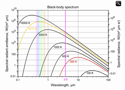 Figure 5.4 shows the Planck curve for black bodies at 5777 K and 300 K (close to the Sun and Earth's "black body" temperatures).
