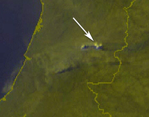An example of Meteosat Second Generation. This RGB, which uses the HRVIS channel for red and green and IR10.8 for blue, shows a smoke cloud towards the center of the image and immediately northeast some pyrocumulus clouds (white arrow).