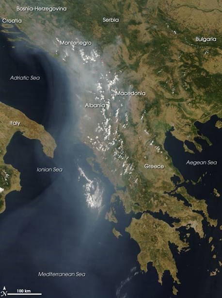 This first MODIS image taken on 29 July 2007 shows parts of Greece, Montenegro, Macedonia and Albania. Both fire smoke clouds and water clouds are seen in this image.