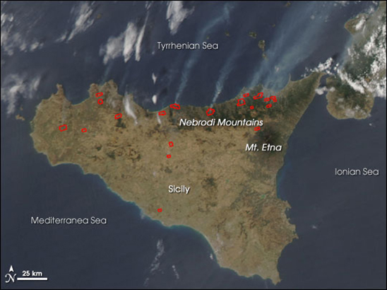 Smoke and fire product (polygons in red) over Sicily. The northward flow of the smoke indicates the wind direction clearly.